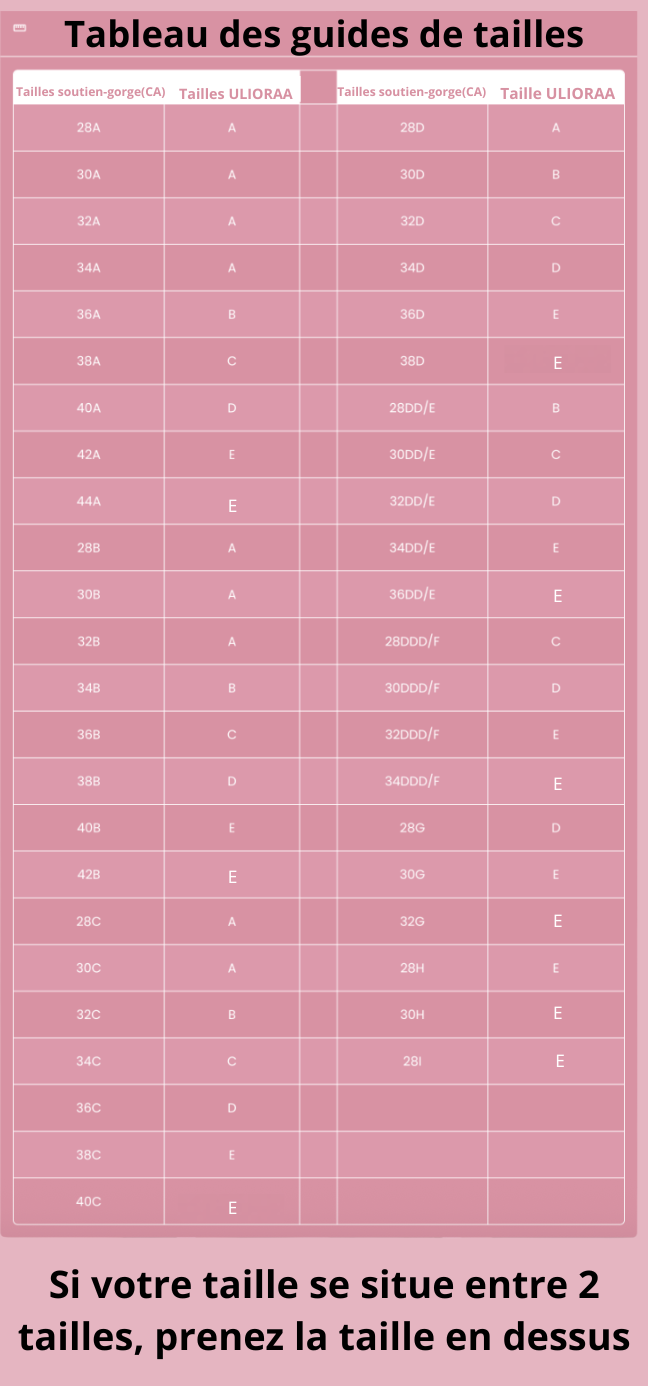 nos tailles sont basés sur les tailles des soutien gorge, consultez notre guide des tailles pour bien vous situé. Cliquez ici pour voir le tabelau