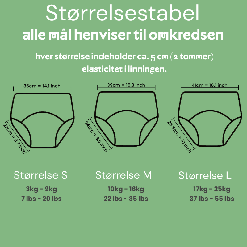 For de bedste resultater skal du sikre dig, at du har valgt den rigtige størrelse: vores undertøj skal sidde tæt omkring barnets ben uden at være for stramt.