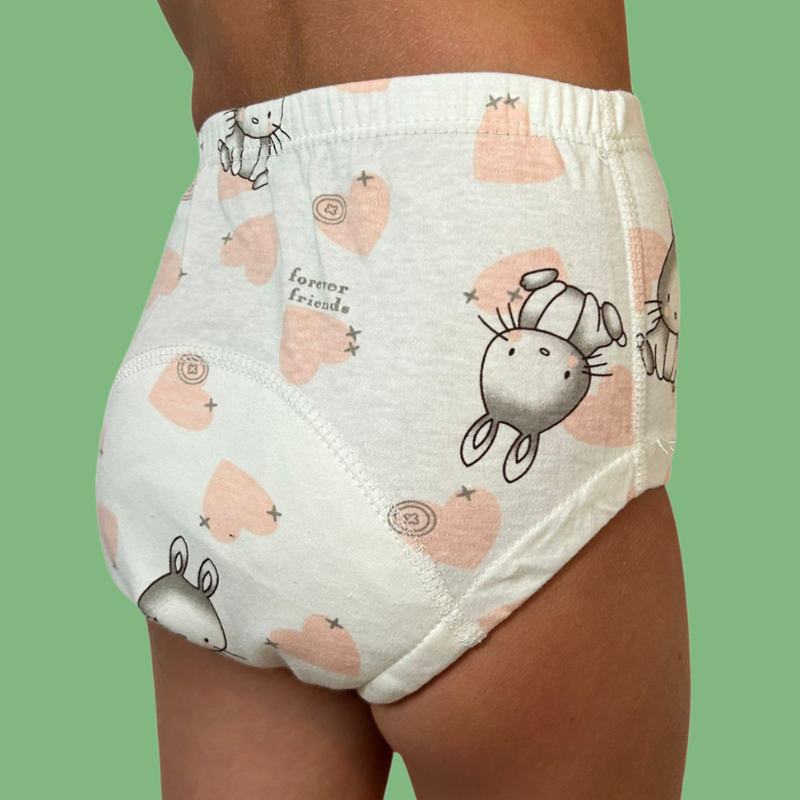 Det inderste bomuldslag leder fugten direkte til barnets hud, så de straks kan tænke: “Jeg er våd!” – i modsætning til bleer, der skjuler fornemmelsen.